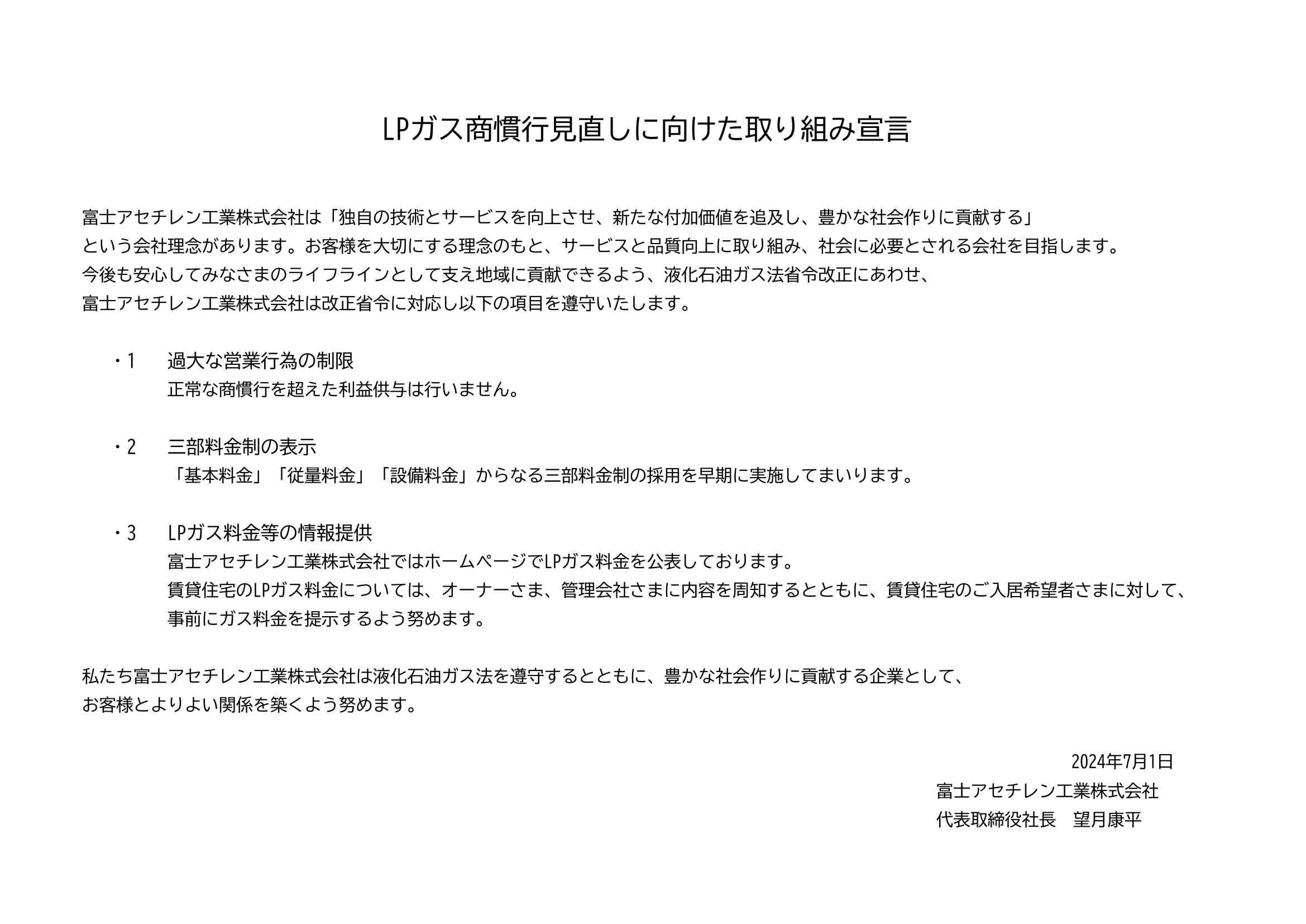 富士アセチレン工業株式会社は、液化石油ガス法の改正に基づき、「三部料金制の導入」や「過大な営業行為の制限」など、透明性の高い業務運営を実現するための取り組みを進めています。お客様に安心してご利用いただけるサービスを提供し、豊かな社会作りに貢献することを目指しています。